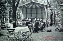 Lata 1907-1912 , Pawilon muzyczny przy Domu Strzeleckim. Dzisiejsze tereny szkolne były w przeszłości największym miejscem rozrywki w Żmigrodzie. Założenie powstało w 1928 roku. Znalazły się w nim siedziba Bractwa Strzeleckiego, strzelnica, pawilon muzyczny, stół bilardowy, kręgielnia, kort tenisowy i łąka przeznaczona na różnego rodzaju imprezy. Latem w ogrodzie ustawiano ponad 100 stołów dla 600 gości. |
