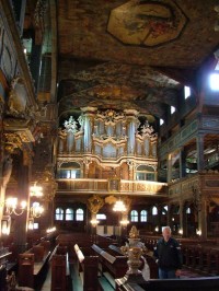 1 pobranie 1482 odsłony 5.39 średnia ocen Poprzednie i następne zdjęcia ruzams Obiekty widoczne na zdjęciu Organy więcej zdjęć (26) Wnętrza kościoła więcej zdjęć (87) Kościół Pokoju - Kościół Trójcy Świętej Ewangelicko-Augsburski więcej zdjęć (144) Wykonawca: Albrecht von Säbisch Atrakcja turystyczna Zbudowano: 1656 Dawniej: Friedenskirche Zabytek: 131 z 2.01.1950 Kościół Pokoju pw. Trójcy Świętej w Świdnicy jest zabytkowym budynkiem sakralnym wybudowanym na mocy porozumień traktatu westfalskiego zawartego w 1648 i kończącego wojnę trzydziestoletnią. Należy do świdnickiej parafii Kościoła Ewangelicko-Augsburskiego w Polsce. Świdnicki Kościół Pokoju jest ostatnim z trzech Kościołów pokoju po obiektach w Głogowie i Jaworze, pod którego kamień węgielny położono 23 sierpnia 1656. Autorem projektu był wrocławski mistrz budowlany Albrecht von Saebisch. Kościół wybudowali śląscy ewangelicy - dzięki wstawiennictwu monarchii szwedzkiej katolicki cesarz Austrii Ferdynand III Habsburg dla zachowania pokoju zezwolił w swym katolickim kraju wybudować na Śląsku trzy świątynie protestanckie. Miał to być gest tolerancji, ale i tak ustanowiono utrudnienia dla ewangelików. Kościół musiał być lokowany poza murami miasta, oddalony od nich na odległość strzału armatniego, nie mógł mieć dzwonnicy, musiał być zbudowany z materiałów nietrwałych (drewna, słomy, piasku, gliny), a dodatkowo okres budowy nie mógł przekroczyć 1 roku. Pierwsze nabożeństwo w nowym świdnickim kościele odprawiono 24 czerwca 1657 W 1708, kiedy sytuacja wyznaniowa ewangelików się polepszyła, obok kościoła wybudowano dzwonnicę i szkołę ewangelicką. Oba budynki zachowały się do dziś. W 2001 Kościół Pokoju w Świdnicy został wpisany na listę światowego dziedzictwa UNESCO. Stanowi symbol pojednania polsko-niemieckiego - nie tylko ze względu na nazwę, ale też na wspólną wizytę w świdnickim kościele w 1989 premiera Polski Tadeusza Mazowieckiego i kanclerza Niemiec Helmuta Kohla, kiedy obaj politycy modlili się tu o pokój i pojednanie. Kościół Pokoju w Świdnicy został wzniesiony w systemie szachulcowym jako bazylika wybudowana na planie krzyża greckiego, mierząca 44 m dłg. i 30,5 m szer. Na parterze i czterech piętrach empor mogło się zmieścić 7500 osób (w tym 3000 miejsc siedzących). Kościół był budowany z myślą o pomieszczeniu jak największej liczby osób, co było ważne zwłaszcza w czasach ograniczania wolności wyznania dla protestantów. Dlatego też świątynia posiada ogromną powierzchnię wewnętrzną (1090 m²) i kubaturę. Do wyjątkowo cennych elementów wyposażenia kościoła należą jego ołtarz i ambona. Barokowa ambona, dzieło Gotfrieda Augusta Hoffmanna, pochodzi z roku 1729. Jest zdobiona scenami biblijnymi oraz płaskorzeźbionymi alegoriami Wiary, Nadziei i Miłości. Nad drzwiami do ambony umieszczona jest rzeźba Jezusa Dobrego Pasterza. Ołtarz główny, również dzieło Hoffmanna, został zamówiony z okazji stulecia kościoła w 1752 i ukończony w następnym roku. Nad mensą ołtarzową umieszczona jest płaskorzeźba przedstawiająca Ostatnią Wieczerzę. Zachowały się też zabytkowe organy z barokowym prospektem z lat 1666 - 1669. Stropy kościoła są ozdobione malowidłami ilustrującymi sceny z Objawienia św. Jana i alegorią Trójcy Świętej. Info [ Wikipedia] pl. Pokoju więcej zdjęć (517) Dawniej: An der Friedenskirche, Cmentarna 1945 |