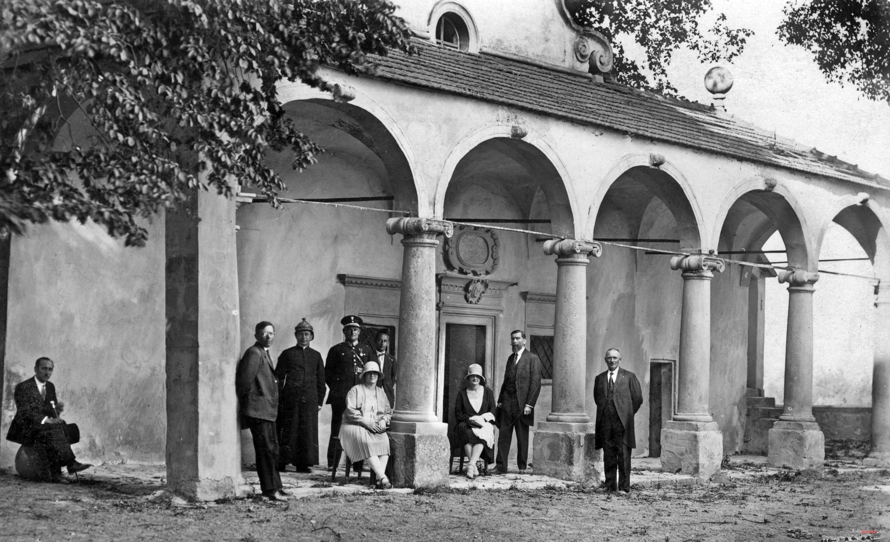 Lata 1920-1925 , Fotografia grupowa na tle kolumnady kaplicy zamku Książąt Wielopolskich.Skomentuj zdjęcie