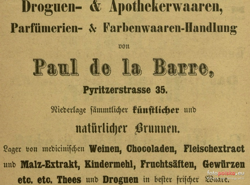 1876 , Handel artykułami drogeryjnymi, perfumeryjnymi i barwiącymi. Paul de la Barre, Depozyt wszystkich sztucznych i naturalnych fontann. |