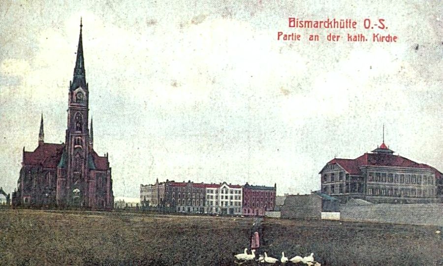 Lata 1910-1940 , Kościół Wniebowzięcia NMP, po prawej budynek Dyrekcji Huty BatorySkomentuj zdjęcie |