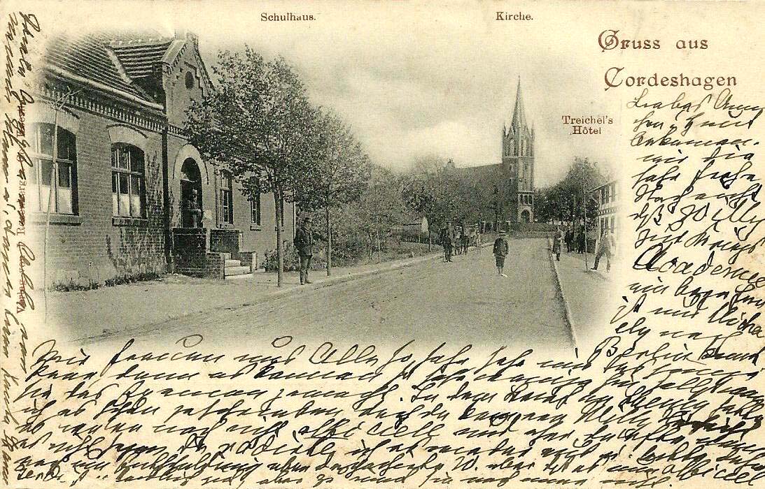 1900 , Na zdjęciu od lewej: budynek szkoły, kościól i fragment hotelu p. Treichela.Skomentuj zdjęcie |
