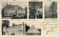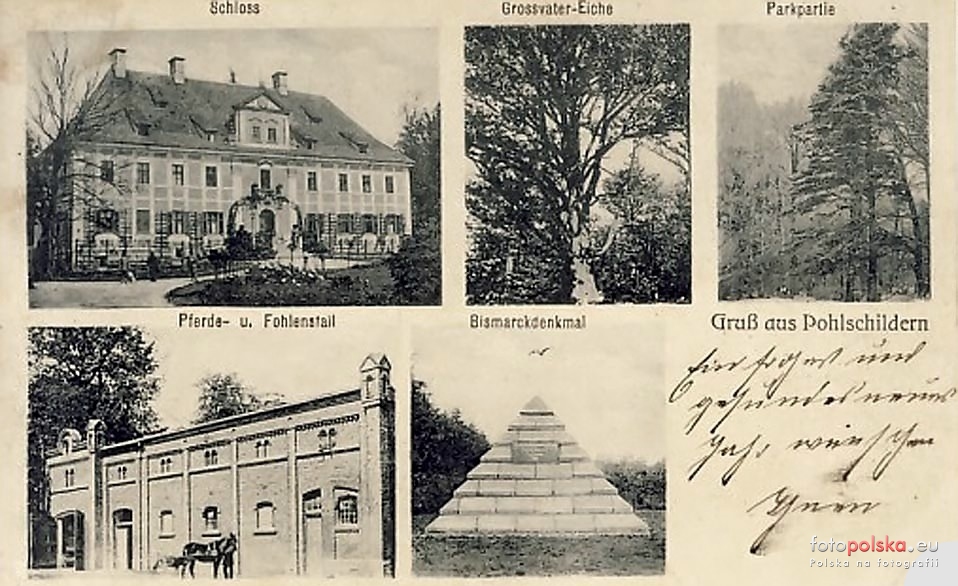 Lata 1905-1910 , Szczytniki Nad Kaczawą na karcie pocztowej z początku XXw. Widzimy na niej m.in. pałac oraz pomnik Bismarcka.
