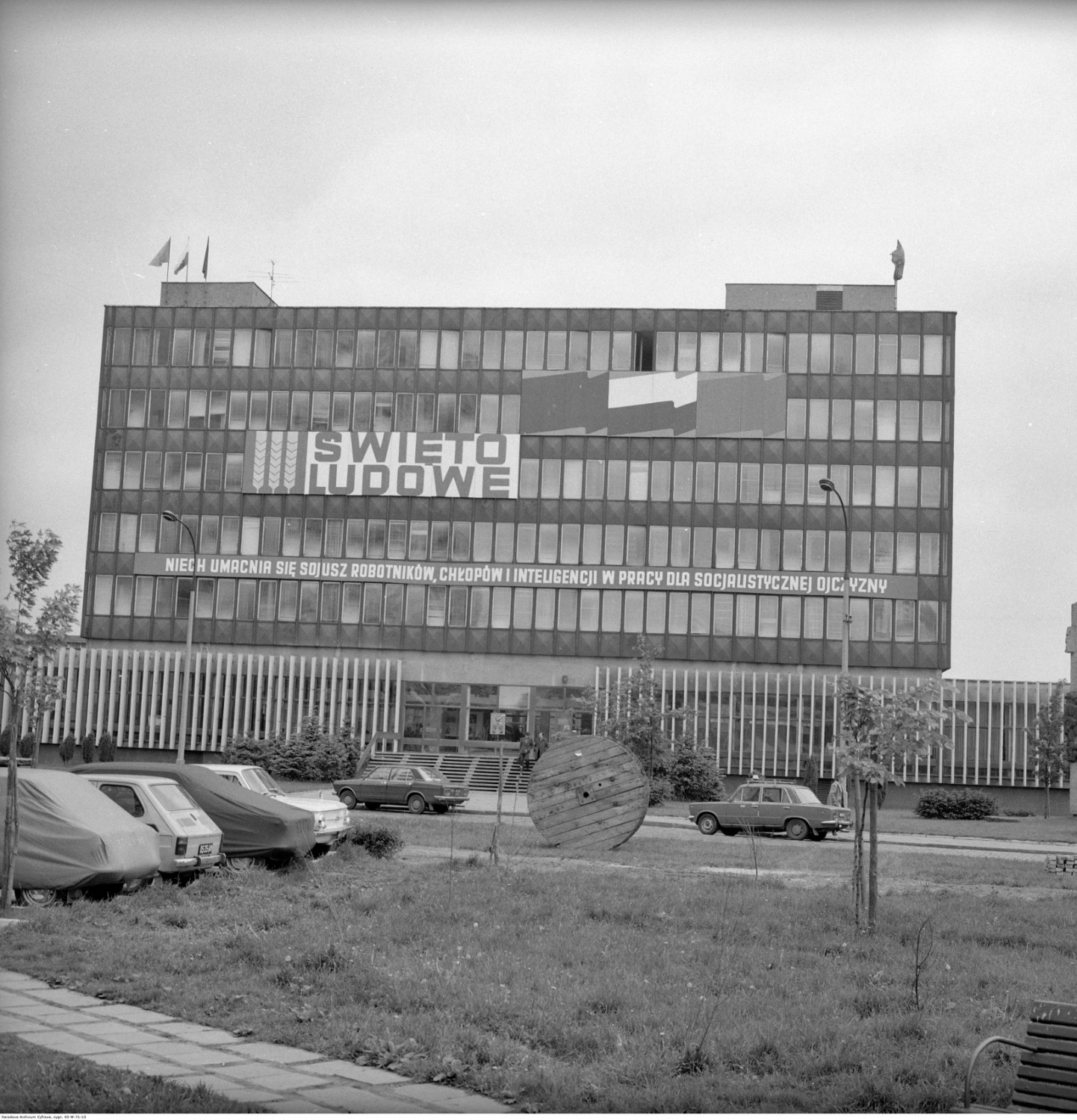 czerwiec 1976 , Budynek z transparentami "Święto ludowe - niech umacnia się sojusz robotników, chłopów i inteligencji w pracy dla socjalistycznej ojczyzny".Skomentuj zdjęcie