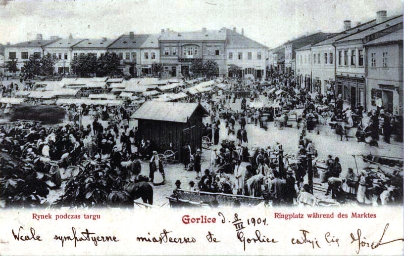 Lata 1900-1904 , "Wcale sympatyczne miasteczko te Gorlice" . Rynek w czasie targu.Skomentuj zdjęcie |