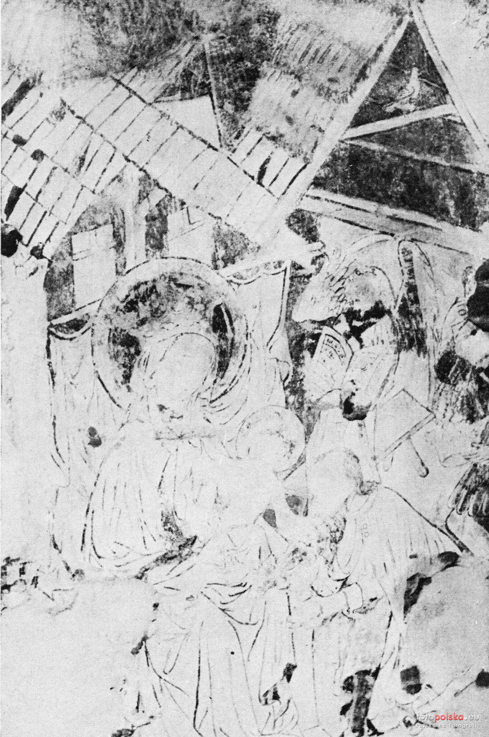 Lata 1959-1960 , Wnętrze kościoła św. Antoniego, fragment polichromii południowej ściany prezbiterium ze sceną Pokłonu Trzech Króli.Skomentuj zdjęcie |