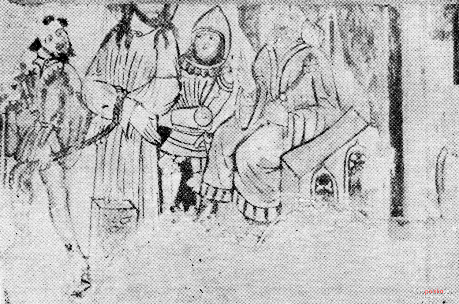 Lata 1959-1960 , Wnętrze kościoła św. Antoniego, fragment polichromii południowej ściany nawy z przedstawieniem Chrystusa przed Piłatem.Skomentuj zdjęcie |