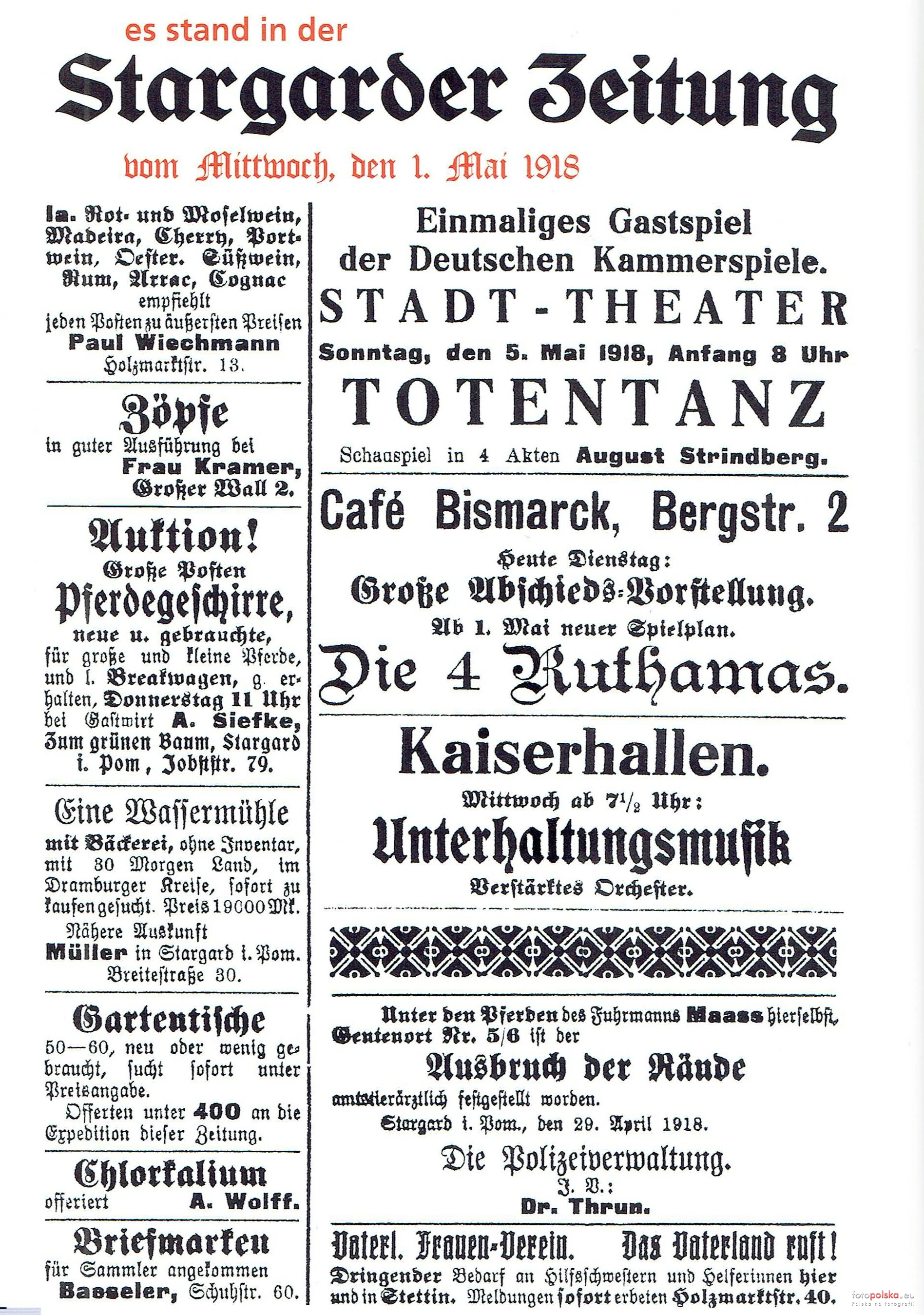 To ukazało się w Stargarder Zeitung w środę, 1 maja 1918 r.