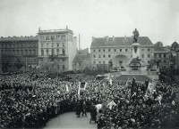 5 listopada 1905 , Kilku tysięczny pochód narodowy zorganizowany przez Narodową Demokrację w celu przyznania Królestwu Polskiemu autonomii. Na zdjęciu Krakowskie Przedmieście i pomnik Mickiewicza.Skomentuj zdjęcie |