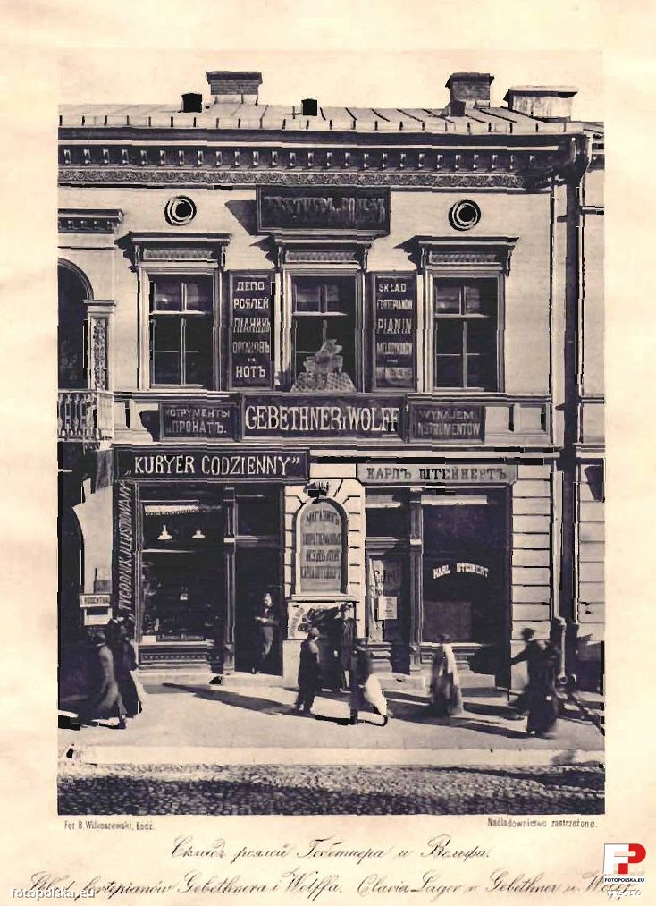 1896 , Łódź. Skład fortepianów Gebethnera i Wolffa. [B. Wilkoszewski, Widoki Łodzi, Warszawa 1896] (prośba o właściwe przypisanie)Skomentuj zdjęcie
