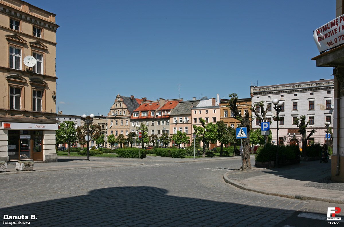 maj 2009 , Ziębicki rynek przedzielony jest zabudową śródrynkową z małą uliczką bez nazwy. Położony niżej plac to skwer obsadzony brzegiem przyciętymi drzewami. |
