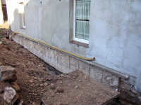 5 marca 2019 , Odkopane przez kopareczkę która zaintrygowała Vetinariego fundamenty budynku (nie jest podpiwniczony). Rura drenarska położna, żwirek wysypany i na to pójdzie pionowa folia kubełkowa. Potem zostanie zasypana.Skomentuj zdjęcie