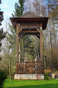 4 kwietnia 2014 , Drewniana dzwonnica pochodząca prawdopodobnie z lat siedemdziesiątych XXw., kryta gontem, na kamiennej podmurówce, usytuowana jest po prawej stronie od wejścia głównego do kościoła i mieści w sobie trzy dzwony o imionach: