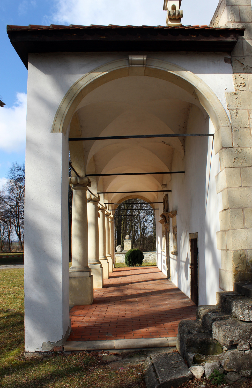 12 marca 2019 , Zamek na Mirowie. Kaplica pałacowa św. Zofii i św. Piotra Apostoła - oba pawilony mają krużganki od strony dziedzińca pałacowego, z kolumnami kamiennymi i zamknięciem łukowym sklepień krzyżowych, przykryte daszkami. Schody prowadzą do wejścia bocznego.