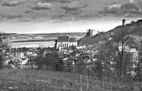 W tle - kościół św. Jana Chrzciciela i św. Bartłomieja, ruiny zamku, baszta, a po prawej kościół św. Anny.