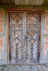22 kwietnia 2019 , Lizaki 7. Kościół Judy Tadeusza. Stare drewniane drzwi wejściowe z czterema płaskorzeźbami symbolami czterech ewangelistów: |