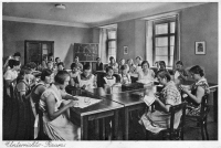 Lata 1933-1938 , Provinzial-Kinder Genesungsheim. Zdjęcie z prospektu informacyjnego szkoły z internatem dla dziewcząt, która działała przy ośrodku. Była to tzw. "szkoła żon" ukierunkowana na wszelkie prace związane z prowadzeniem gospodarstwa domowego. Tu sala do zajęć z wyszywania.Skomentuj zdjęcie