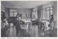 Lata 1933-1938 , Provinzial-Kinder Genesungsheim. Zdjęcie z prospektu informacyjnego szkoły z internatem dla dziewcząt, która działała przy ośrodku. Była to tzw. "szkoła żon" ukierunkowana na wszelkie prace związane z prowadzeniem gospodarstwa domowego. Tu magiel i prasowalnia pościeliSkomentuj zdjęcie