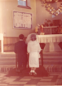 1973 , Fragment pierwotnego wystroju prezbiterium na ślubnej fotografii z 1973 roku.Skomentuj zdjęcie |
