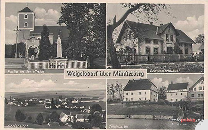 Lata 1920-1930 , Wigancice na czteropolowej widokówce. Widać na niej m.in. kościół św. Bartłomieja. |