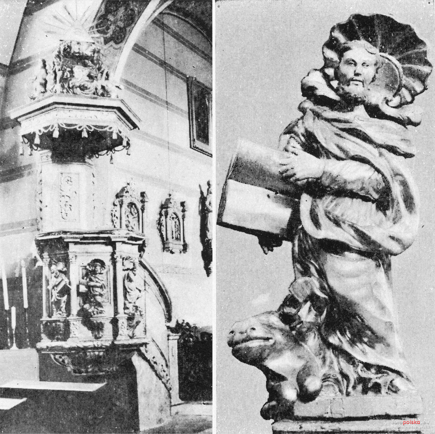 Lata 1962-1963 , Wnętrze kościoła św. Piotra i św. Pawła, ambona z ok. 1700 r. i rzeźba ewangelisty (Łukasza ?) znajdująca się na ambonie.Skomentuj zdjęcie |