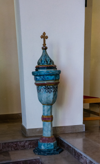 2 czerwca 2019 , Drewniana chrzcielnica przeniesiona ze starego kościoła. Najprawdopodobniej z XVI w.
