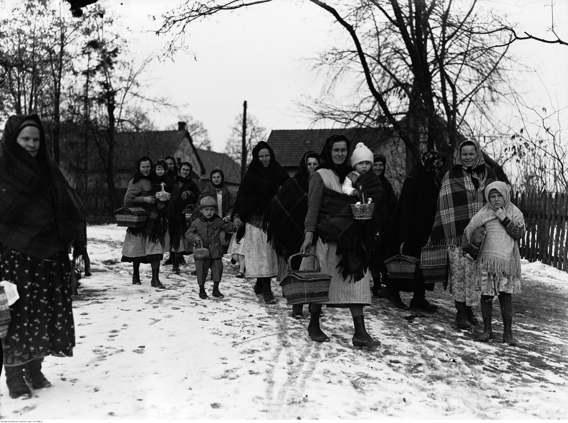 marzec 1932 , Niepołomice nn. Wielka sobota - Grupa kobiet z dziećmi ze święconkami w drodze do kościoła.Skomentuj zdjęcie |