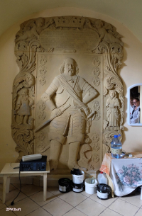 17 lipca 2019 , Wnętrze kościoła św. Bartłomieja, świątynia wybudowana z kamienia w XV w., po przebudowie w l. 1721-22. Na zdjęciu epitafium w dawnej kaplicy grobowej pełniącej obecnie funkcję zakrystii. Płyta Jobsta von Almeslöe , cesarskiego pułkownika, zmarłego w 1652 r. W zakrystii trwały akurat prace porządkowe po remoncie pomieszczenia.