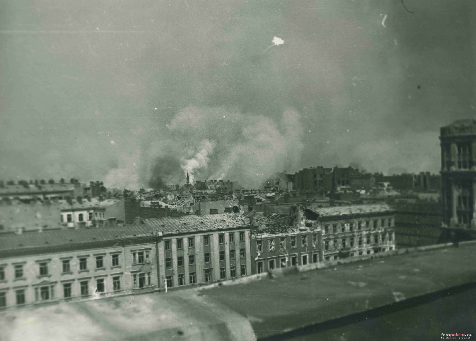 sierpień 1944 , Płonące i zniszczone budynki przy ulicy Królewskiej. Na pierwszym planie północna pierzeja placu Dąbrowskiego.Skomentuj zdjęcie