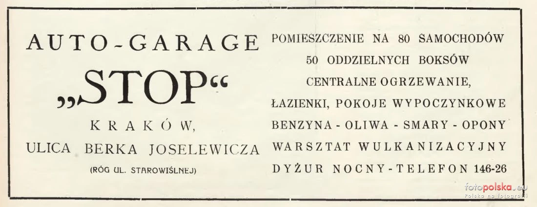 0 pobrań 19 odsłon 0 średnia ocen Poprzednie i następne zdjęcia Ewqa100 Obiekty widoczne na zdjęciu Sklep "Biedronka" więcej zdjęć (3) Zbudowano: 1925 Dawniej: Garage "Stop" W 1925 roku, kosztem 55.000 dolarów wybudowano przez znanego w kołach Krakowskich dyr. Władysława Lubelskiego, wielki garaż p. n. „Stop". Budając, wzorowano się na najleprzych, tego rodzaju, urządzeniach zagranicznych. Nic też dziwnego, że garaż ten zajmuje w Krakowie czołowe miejsce i cieszy się uznaniem licznej klijenteli. Zajmując obszar 2500 mtr.2 liczy 52 boksy 3X6 mtr, Pozatem pomieścić może 100 samochodów Oświetlony elekrycznością. Szoferzy garażowych samochodów posiadają pokoje wypoczynkowe, łazienki oraz czytelnie Na miejscu uskutecznia się sprzedaż benzyny, smarów i opon. W ubiegłym roku sprzedano 20 cystern benzyny, oraz okoto 17.000 kg. oliwy. Przeciętnie garażowanych jest 80 maszyn dziennie. Garaż posiada własne pogotowie ratunkowe - auto ciężarowe do przewożenia „chorych" samochodow. Organizacja, sprężystość kierownictwa, oraz wyszkoleni pracownicy dają pełną gwarancję akuratnej i sumiennej obsługi. Dla wygody klijentów, otwarty bez przerwy całą dobę. Źrodło: Express" rel="nofollow" target="_blank" class="Scolor" style="text-decoration:underline">https://jbc.bj....015%22">Express
