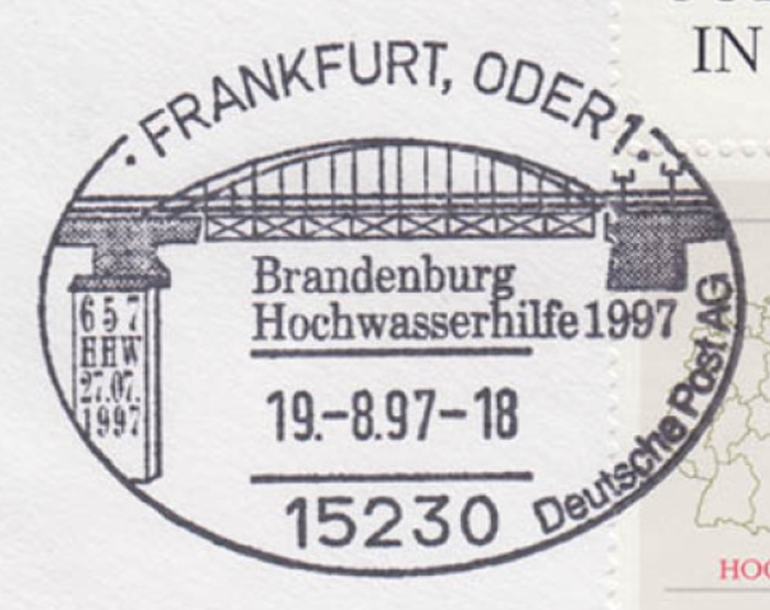 1997 , Okolicznościowy stempel pocztowy przedstawiający jedno przęsło mostu granicznego na Odrze.Skomentuj zdjęcie |