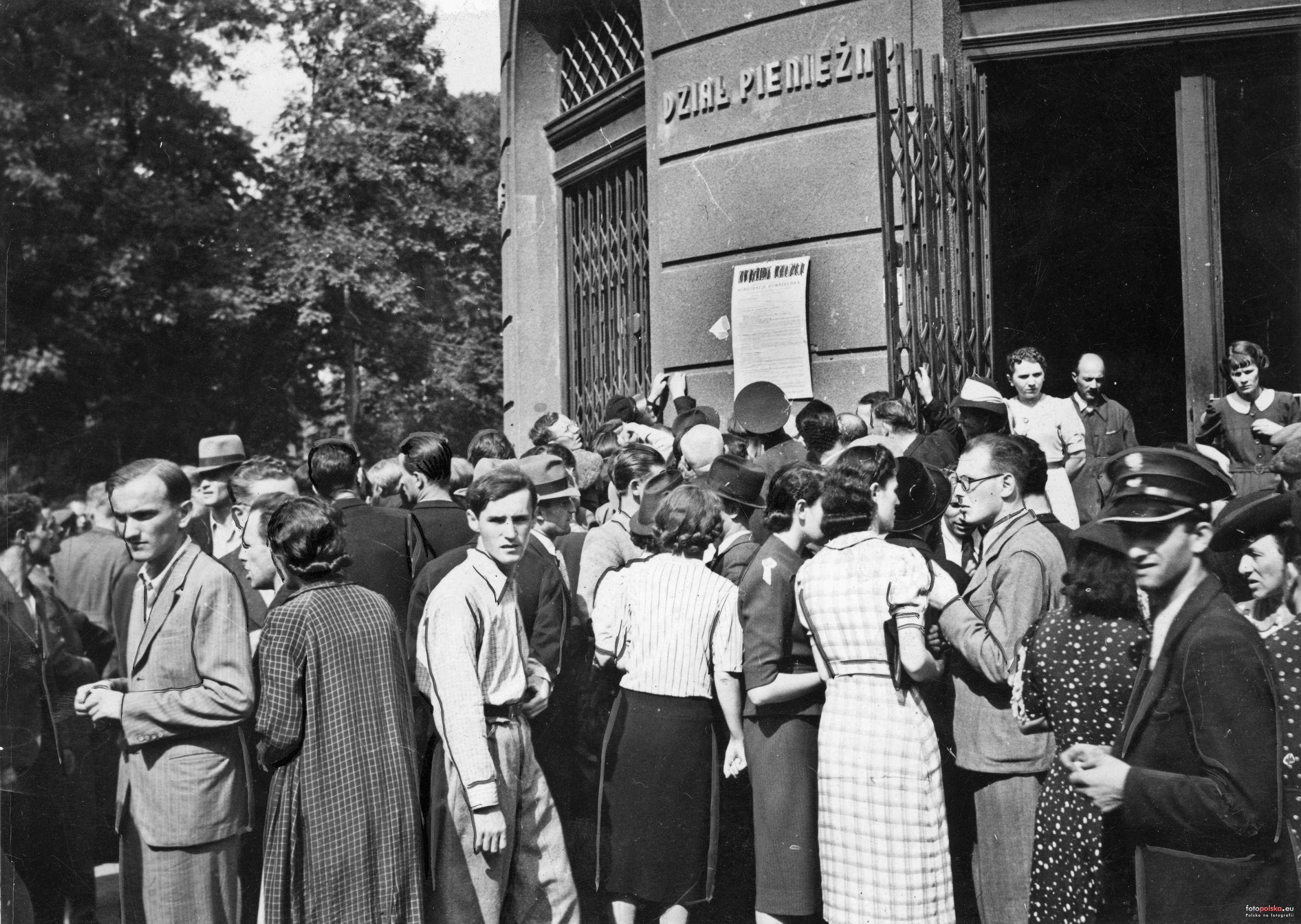 sierpień 1939 , Mieszkańcy Krakowa zgrupowani przed budynkiem Poczty Głównej, Na ścianie przy drzwiach wejściowych widoczne obwieszczenie o mobilizacji (30 lub 31 sierpnia).Skomentuj zdjęcie