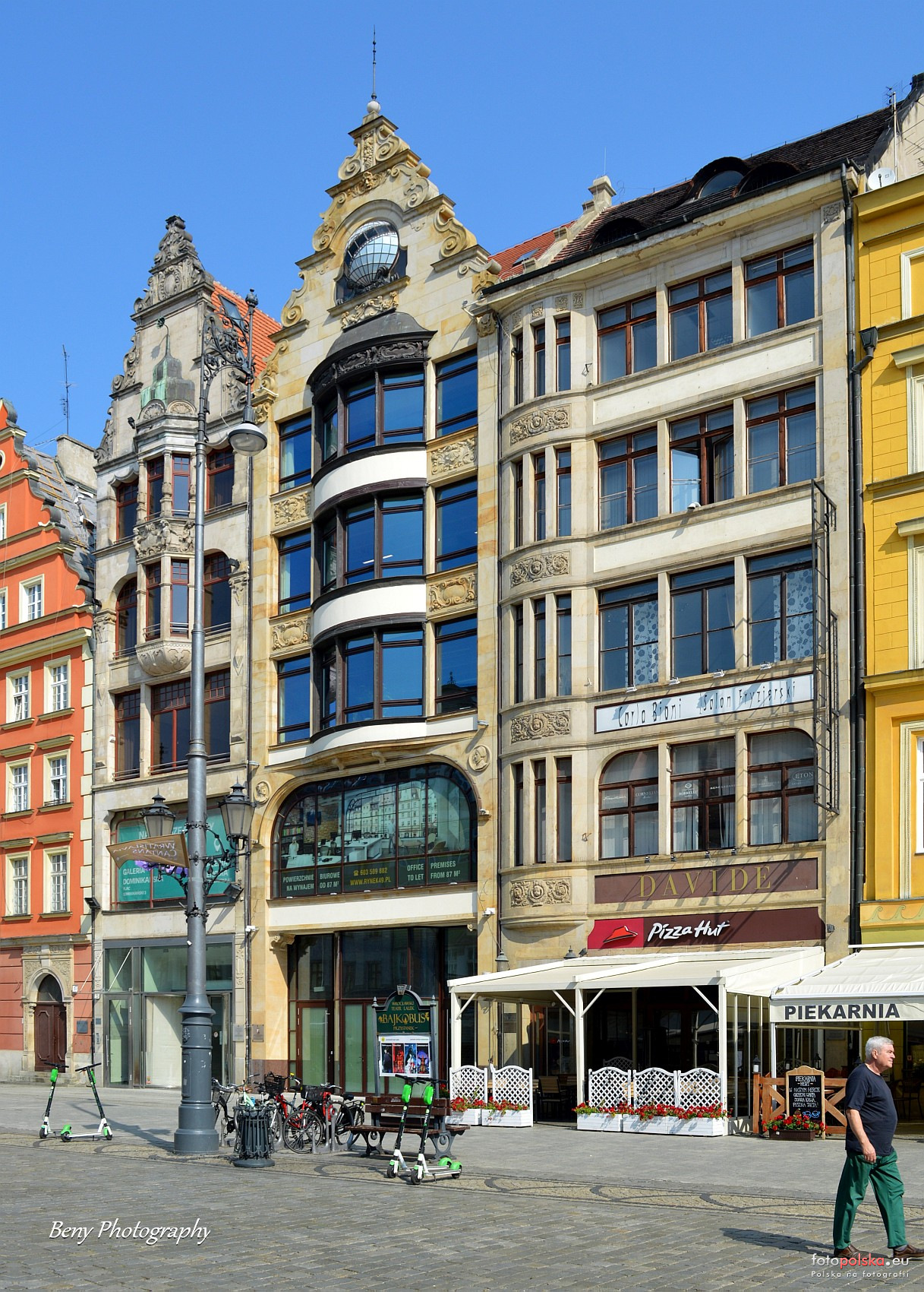 3 pobrania 424 odsłony 6 średnia ocen Poprzednie i następne zdjęcia Marek Dymek Obiekty widoczne na zdjęciu Kamienica "Pod Głową św. Jana" więcej zdjęć (27) Zbudowano: 1908 Dawniej: Dom Handlowy "Der Große Bazar" Północna strona rynku - "Targ Łakoci" więcej zdjęć (383) Dawniej: Naschmarkte Seite Strona północna Po północnej stronie (numery 42 do 60), dawniej określanej jako Strona Targu Łakoci (Naschmarkt-Seite), znajdują się m.in. trzy domy towarowe zbudowane według projektów biura Schlesinger i Benedict[5] w pierwszej dekadzie XX w. pod numerami 48, 49 i 50. Również tutaj duża część kamienic to powojenne swobodne rekonstrukcje. W kamienicy Pod Złotą Kotwicą (pod numerem 52) zachowała się we wnętrzu renesansowa kolumna, zaś dom pod numerem 46 jest oryginalnym zabytkiem barokowym. Rynek 42 Apteka Pod Podwójnym Złotym Orłem Rynek 43 Kamienica Pod Złotym Pelikanem Rynek 44 Kamienica Pod Złotym Jeleniem do XVII w. zwana Apteką Targu Łakoci Rynek 45 Rynek 46 Rynek 47 Szwedzka Sień Rynek 48 Kamienica Pod Głową św. Jana nazywana tak od rozebranej w poł. XIX w. wcześniejszej kamienicy. Obecnie znajduje się tu wczesnomodernistyczny dom towarowy z 1908 r. Rynek 49 Rynek 50 Rynek 51 Kamienica Pod Złotym Półksiężycem Rynek 52 Kamienica Pod Złotą Kotwicą Rynek 53 Rynek 54 Kamienica Pod Morwą Rynek 55 Rynek 56 Rynek 57 Rynek 58 Kamienica Pod Złotą Palmą neorenesansowy dom towarowy z pocz. XX w. na miejscu dwóch wcześniejszych kamienic. Rynek 60 Źródło: Rynek 49 więcej zdjęć (44) Zbudowano: 1903 Dawniej: Dom Handlowy Trautner Rynek 50 więcej zdjęć (34) Zbudowano: 1904 Dawniej: Dom Handlowy Hünert, EMPiK Megastore) Rynek więcej zdjęć (6101) Dawniej: Ring Rynek we Wrocławiu (niem. Großer Ring in Breslau) – średniowieczny plac targowy we Wrocławiu, obecnie centralna część strefy pieszej. Stanowi prostokąt o wymiarach 205 na 175 m[1]. Jest to jeden z największych rynków staromiejskich Europy. Zabudowę otaczającą Rynek stanowią budynki pochodzące z różnych epok historycznych. Centralną część Rynku zajmuje blok śródrynkowy, składający się z Ratusza, Nowego Ratusza oraz licznych kamienic. Rynek tworzy układ urbanistyczny wraz z przekątniowo przyległymi placem Solnym oraz placem wokół kościoła św. Elżbiety. Do Rynku prowadzi 11 ulic – po dwie w każdym narożniku (Świdnicka, Oławska, E. Gepperta (Zamkowa), Ruska, św. Mikołaja, Odrzańska, Kuźnicza, Wita Stwosza), ponadto przebity w XIV lub XV w. Kurzy Targ po stronie wschodniej oraz wąskie ul. Więzienna i Przejście św. Doroty. Rynek powstał w związku z lokacją Wrocławia, wedle nowszych badań już za czasów Henryka Brodatego, między 1214 a 1232. Starsze publikacje twierdziły, że powstał dopiero w czasie powtórnej lokacji w 1241-1242. Z biegiem czasu wokół Rynku powstały kamienice patrycjatu, a około połowy XIV wieku utworzyły ciągłe pierzeje i nastąpiło utrwalenie podziałów własnościowych. W XIX w. przez Rynek poprowadzono linie tramwaju, najpierw konnego, a później także elektrycznego. Tramwaje kursowały przez Rynek do połowy lat 70. zeszłego stulecia, gdy przeniesiono je na Trasę W-Z. W latach 1996-2000 wyremontowano nawierzchnię Rynku, ostatecznie zamykając ruch samochodowy po jego wschodniej stronie, jak również odnowiono większość elewacji. Przy Rynku znajduje się obecnie 60 numerowanych posesji, przy czym niektóre budynki posiadają kilka numerów. Podziały działek przebiegają najczęściej inaczej niż dawne podziały lokacyjne, na skutek wtórnych podziałów i scaleń. Każda działka posiada również swoją historyczną nazwę, zwykle związaną z atrybutem umieszczonym niegdyś na elewacji kamienicy lub losami miejsca, np. Pod Gryfami, Pod Błękitnym Słońcem, Stary Ratusz. Źródło: |