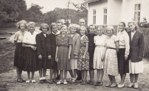 1956 , Na pamiątkę. Wszystkie koleżanki z VII klasy oraz nauczycielka Zofia Nalepa i kierownik Krępa Marian. Czerwiec 1956.Skomentuj zdjęcie |