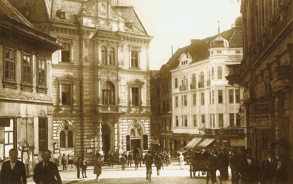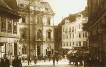 1920 , Fasada gmachu Komunalnej Kasy Oszczędności (dzisiejszej Patrii) w 1920 r. Po lewej widać detal wkrótce rozebranego Domu Tobiasa.Skomentuj zdjęcie |