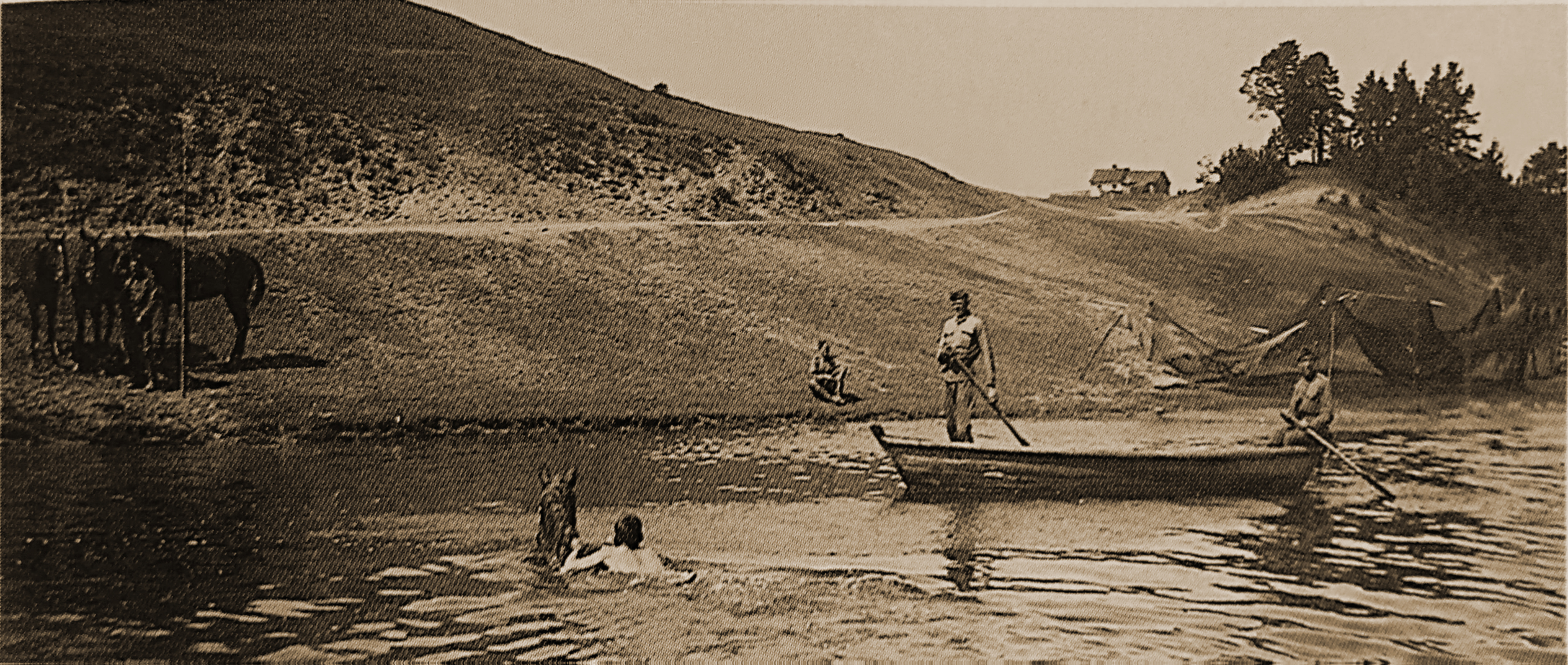 1929 , Nauka pływania za koniem w ramach sześciotygodniowych manewrów wojskowych.Z tyłu widoczna droga prowadząca do wsi Płociczno.Skomentuj zdjęcie |