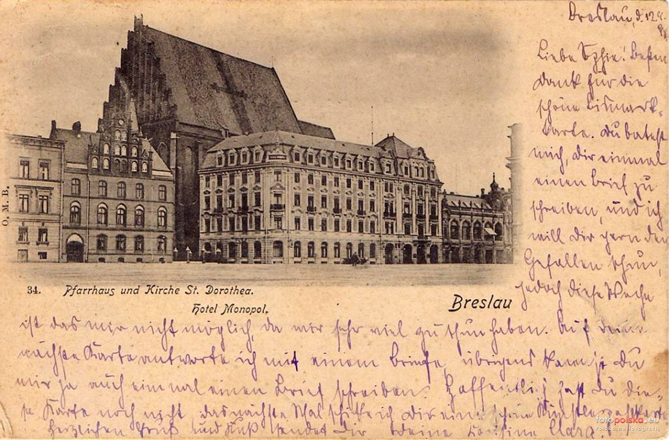 Kościół św. Doroty, Stanisława i Wacława więcej zdjęć (134) Zbudowano: XV w. Dawniej: Dorotheenkirche Zabytek: 14 z 27.11.1947 oraz A/292/90 z 12.02.1962 Kościół pw. śś. Stanisława, Doroty i Wacława z charakterystycznym dla architektury wrocławskiej 2 poł. XV w. korpusem halowym i układem sklepień jest przykładem oryginalnej, śląskiej odmiany gotyku. Historia Kościół wraz z klasztorem augustianów eremitów wzniesiony został z fundacji cesarza Karola IV Luksemburga, potwierdzonej aktem fundacyjnym z 24 listopada 1351 r. Świątynię oraz budowle klasztorne posadowiono na gruncie odkupionym od wrocławskich mieszczan Johanna Stille i Jacoba Reyenfrieda, usytuowanym między wewnętrznym a zewnętrznym pasem murów miejskich, w pobliżu Bramy Świdnickiej, przy głównym trakcie prowadzącym na południe. Klasztor usytuowany na pd i zach. od kościoła przylegał do zewnętrznego pasa fortyfikacji. W 1354 r. wymieniono jako patronów kościoła świętych Wacława, Stanisława i Dorotę, co wg części historiografów miało upamiętniać traktat pokojowy zawarty pomiędzy cesarzem Karolem IV i Kazimierzem Wielkim, na mocy którego Śląsk przeszedł pod panowanie Czech, a diecezja wrocławska pozostała integralną częścią Metropolii Gnieźnieńskiej. Budowę kościoła rozpoczęto od wschodu i zapewne do 1381 r. ukończono prezbiterium. W 1448 r. część kościoła zawaliła się; odbudowa świątyni postępowała dzięki darowiznom wrocławskich mieszczan Johanna Crapffa, Johanna Gremmela, Niklasa Rader (1450 r.) i Niklasa Tiege (1453 r.). Między rokiem 1458, a 1481 założono sklepienia korpusu z fundacji wrocławskiego patrycjusza Wilke von Berlin. W 1455 r. zawieszono dzwon na wieży kościelnej, natomiast rok 1493 r. upamiętniono pod krzyżem wieńczącym fasadę, prawdopodobnie jako datę ukończenia budowli. Ok. 1500 r. w kościele znajdowało się piętnaście ołtarzy, a zgromadzenie zakonne liczyło 40 mnichów. Klasztor składający się z budynków murowanych, drewnianych lub w konstrukcji szkieletowej, skupiony wokół wirydarza i dziedzińca gospodarczego, otrzymał ok. 1500 r. murowany krużganek, kryty sklepieniem sieciowym, którego pn. skrzydło przylegające do korpusu nawowego zachowane jest obecnie jako jedyny relikt zabudowań klasztornych. Kościół i klasztor opuszczony na skutek reformacji przez augustianów, a następnie franciszkanów, którym przekazano go w 1530 r., został w roku 1534 przejęty przez miasto i użytkowany był następnie jako arsenał, magazyn, skład soli i browar. Gotyckie wyposażenie świątyni sprzedano. W 1615 r. franciszkanie ponownie objęli klasztor i 6 lutego 1615 r. konsekrowali kościół, któremu przywrócono funkcje sakralne. W 2 poł. XVII w. naprawiono dach i sklepienia świątyni, a pod prezbiterium założono kryptę. W 1682 r. w przęsłach przyprezbiterialnych naw bocznych wzniesiono parę kopułowych kaplic pw. św. Antoniego z fundacji A. von Massa (nawa pn.) oraz św. Barbary z fundacji J.G. von Fröhlicha und Freudenfels (nawa południowa). W latach 1720-1730 wnętrze budowli zbarokizowano, wprowadzając stiukowe, konsolowe wsporniki sklepienne, portale, konsole na rzeźby na filarach od strony nawy głównej, listwowaną dekorację rozglifień okiennych, arkad międzynawowych i łuku tęczowego, a także nowe wyposażenie wnętrza z zespołem ołtarzy, stallami, amboną i emporami w prezbiterium. Ok. 1712 r. wzniesiono kruchtę północną przy ostatnim przęśle korpusu nawowego, która zastąpiła prawdopodobnie wcześniejszy portal. Kościół wielokrotnie ulegał uszkodzeniom (1748 r.- uderzenie pioruna; 1749 r.- wybuch Wieży Prochowej; 1757 r. - wybuch magazynu prochu; 1799 r. - ponownie uderzenie pioruna). Klasztor poważnie uszkodzony pożarem w 1686 r., został odbudowany w stylu barokowym w latach 1686-1710 oraz w latach 1710-1720 wg. projektu Johanna Blaciusa Peintnera, z reprezentacyjnym budynkiem klauzury. Po sekularyzacji w 1811 r. zabudowania klasztoru stały się własnością miasta, a kościół świątynią parafialną, którą to funkcję pełnił już wcześniej od 1707 roku. Kościół wielokrotnie remontowano, m.in. w 1855 r. - wymiana posadzek i w 1875 r. - wydłużenie okien korpusu. W 1892 r. przystąpiono do regotyzacji światyni wg projektu Gustava Brinkmanna. W 1897 r. rozebrano przylegające budynki klasztorne (poza pn. skrzydłem krużganka) użytkowane przez Wyższy Sąd Krajowy m.in. jako więzienie i magazyny. Umożliwiło to realizację neogotyckiego portalu zach. i wiatrołapu we wnętrzu kościoła. W 1897 r. wykonano także neogotycki portal wsch. w przyziemiu wieży (projekt Gustava Brinkmanna), w 1899 r. przeprowadzono konserwację przypór, z częściową rekonstrukcją fial w partii prezbiterium oraz przekuciem gzymsów podokiennych i wieńczących cokół w obrębie elewacji wschodniej i północnej (projekt Eggerta i Richarda Schultze). Kolejne remonty prowadzono w latach 1913-1914 (dach), 1927-1928 (elewacje), 1926 r. (wymiana części maswerków), 1932 r. (fasada zachodnia), 1927-1937 (wnętrze i wyposażenie). Kościół nieznacznie uszkodzony w 1945 r., remontowano w l. 1945-1947, 1968-1976 i 2002-2005; do 1951 r. pełnił funkcję prokatedry. W 1890 r. teren na południe od kościoła wraz z pozostałymi zabudowaniami klasztornymi został wykupiony przez konsorcjum budowlane, które po przeprowadzeniu rozbiórek rozpoczęło w 1892 budowę hotelu „Monopol“. W latach 1893-1894 wzniesiono obecny budynek plebanii przy pl. Franciszkańskim, wg projektu architekta Grossera; pracami kierował mistrz murarski Handke. Opis Świątynia położona w obszarze Starego Miasta, na południe od Rynku. Teren przylegający do kościoła od zachodu i południa zajmował klasztor, z zabudowaniami skupionymi wokół wirydarza (od południa) i dziedzińca gospodarczego (od zachodu). Kościół gotycki, orientowany, oszkarpowany, z 3-nawowym, 5-przęsło