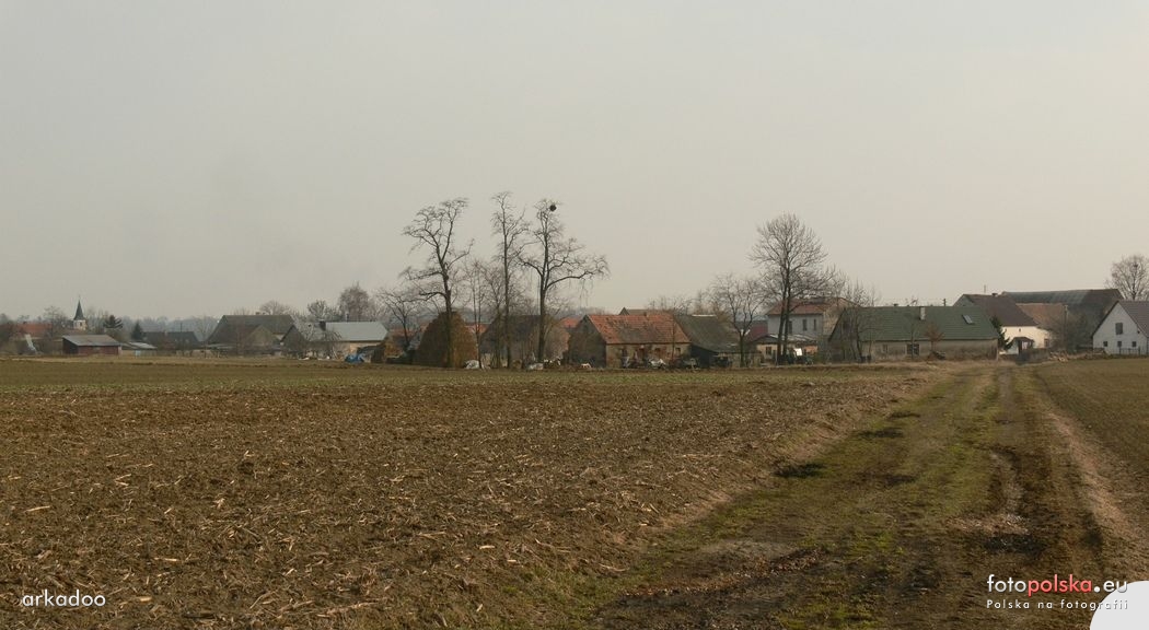 18 marca 2010 , Widok na Bolechów od polnej drogi z Pełczyc. Wieś to typowa ulicówka ze stosunkowo szeroką brukowaną drogą. Na zachodnim i wschodnim krańcu wsi stoją bliźniacze kapliczki. Z lewej strony zdjęcia widoczna wieża kościoła -Skomentuj zdjęcie |