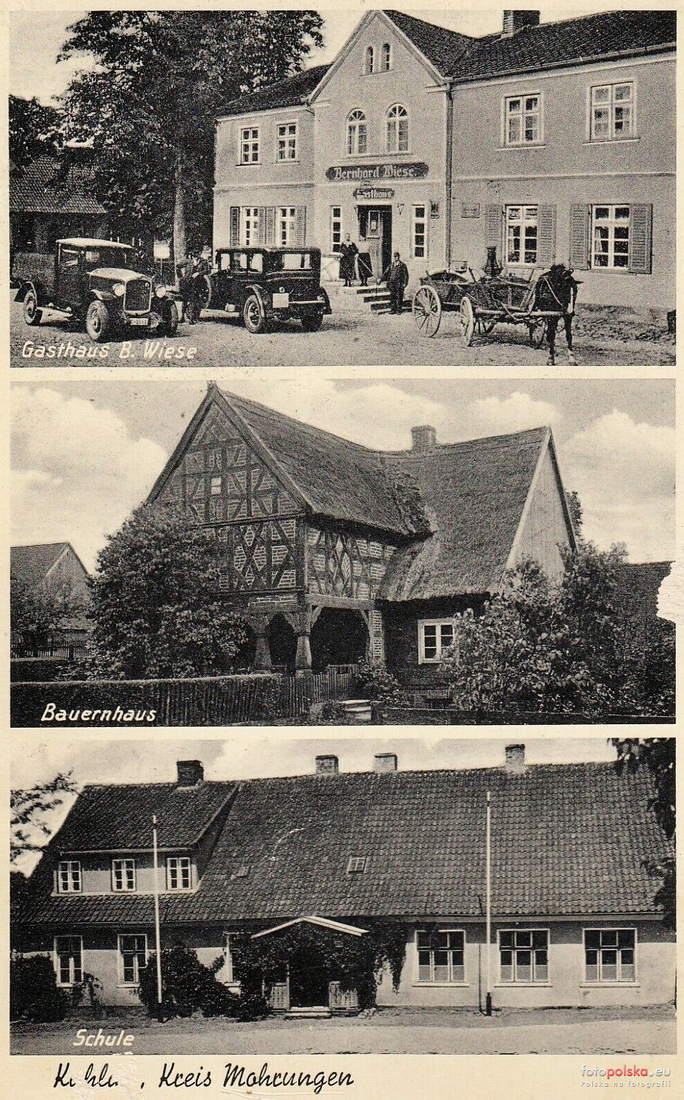 Na zdjęciach przedstawiono zajazd, jeden z domów i szkołę