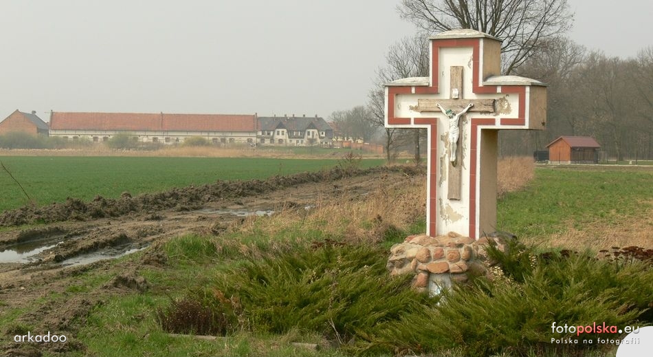 5 kwietnia 2009 , Krzyż przy drodze wjazdowej od południa. W tle zabudowania gospodarcze przy pałacu -Skomentuj zdjęcie |