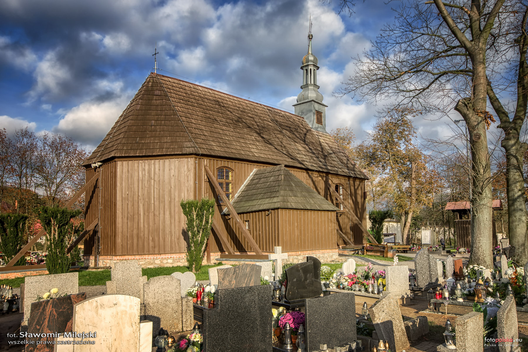 Kościół Michała Archanioła i Matki Bożej Wspomożenia Wiernych więcej zdjęć (21) Zbudowano: 1682-1712 Zabytek: 2425/A z 22.12.1932 Kościół Michała Archanioła i Matki Bożej Wspomożenia Wiernych zbudowany z fundacji ks.biskupa Hieronima Wierzbowskiego, sufragana poznańskiego . Kościół trójbocznie zamknięty, kryty gontem, jednonawowy, ozdobiony wieżyczką o kształcie barokowym. Na zewnątrz kościół jest zabezpieczony pięcioma zastrzałami drewnianymi, które po raz pierwszy postawiono w 1875 r. Ołtarz główny oraz dwa boczne wykonane są w stylu barokowym i pochodzą z XVIII wieku. W ołtarzu głównym znajdują się: gotycka drewniana figura Matki Bożej Wspomożenia Wiernych, oraz drewniane figury św. Szczepana i św. Wawrzyńca.Ołtarze boczne zdobią obrazy Pana Jezusa Miłościwego i św. Michała Archanioła pochodzenia ludowego oraz św. Marii Magdaleny. N uwagę zasługują znajdujące się na bocznych ścianach: drewniane figury św. Michała Archanioła z XVIII w. i Matki Boskiej Bolesnej z XIX wieku. Obok kościoła wznosi się drewniana dzwonnica z 1893 roku. ul. Wodna więcej zdjęć (40) |