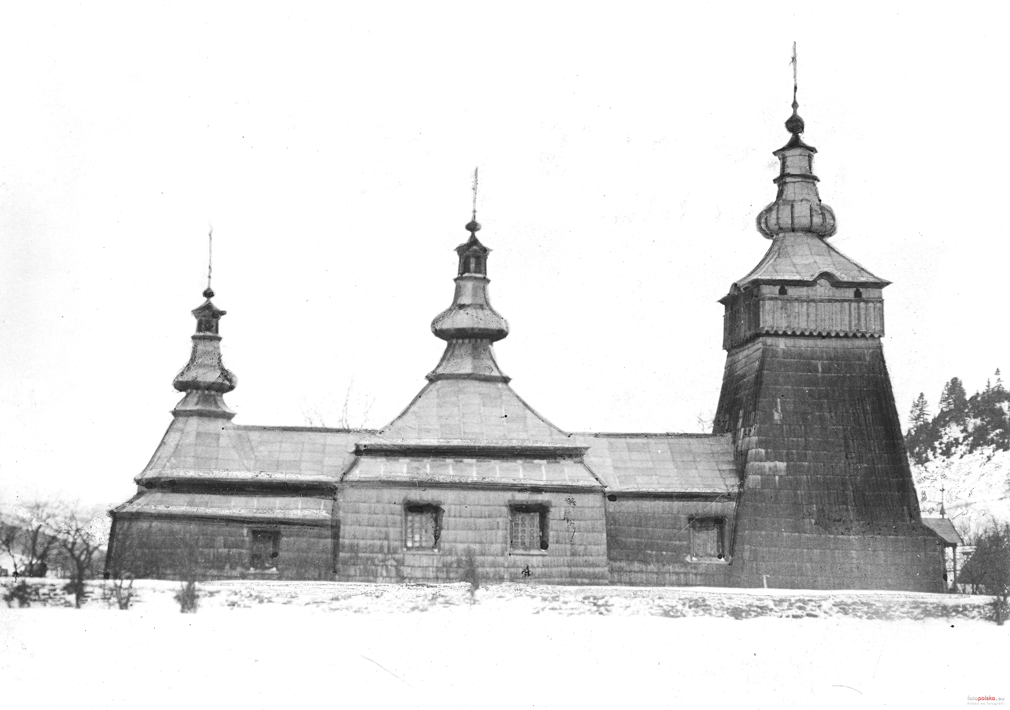1 pobranie 644 odsłony 6 średnia ocen Poprzednie i następne zdjęcia 4elza Obiekty widoczne na zdjęciu Kościół św. Demetriusza więcej zdjęć (35) Zbudowano: 1841 Dawniej: Cerkiew św. Dymitra Zabytek: 774 z 5.09.1964 r. Parafię greckokatolicką w Szczawniku założył w 1624 r. biskup krakowski Marcin Szyszkowski. Cerkiew została wzniesiona w 1841 r. ale nie można wykluczyć, że nastąpiło wtedy przekształcenie starszej świątyni. Od 1947 r. obiekt używany jest jako kościół katolicki i stanowi świątynię filialną w parafii Złockie. ARCHITEKTURA. Cerkiew łemkowska, w typie północno zachodnim. Drewniana o konstrukcji zrębowej z wieżą konstrukcji słupowej. Trójdzielna, złożona z kwadratowej nawy, prezbiterium zamkniętego trójbocznie oraz prostokątnego babińca, nad którym nadbudowana wieża o pochyłych ścianach, z nadwieszoną izbicą. Dachy nad prezbiterium i nawą namiotowe, kryte blachą, zwieńczone makowicami ze ślepymi latarniami. Identyczna makowica wieńczy wieżę. Wewnątrz nawa i prezbiterium nakryte sklepieniami zwierciadlanymi. Polichromia wnętrza figuralna i ornamentalna z 1936 r. WYPOSAŻENIE WNĘTRZA. W prezbiterium ikonostas późnobarokowy z przełomu XVIII/XIX w. z kompletem ikon, przed ikonostasem ustawiony jest ołtarz klasycystyczny z 1. poł. XIX w. z obrazem Ukrzyżowania. W nawie dwa ołtarze boczne, późnobarokowe z XVIII w. W prawym ołtarzu obraz Opłakiwania Chrystusa z XVIII w., w lewym Przemienienia Pańskiego z tego samego czasu. Na ścianach cerkwi zawieszone są ikony, do najciekawszych należy Chrystus Pantokrator z XVII w., św. Barbara z 1867 r. oraz wotywny obraz Ukrzyżowania z 1854 r., z namalowaną pod krzyżem parą chłopskich fundatorów. W wieży dzwon z 1707 r. źródło : |