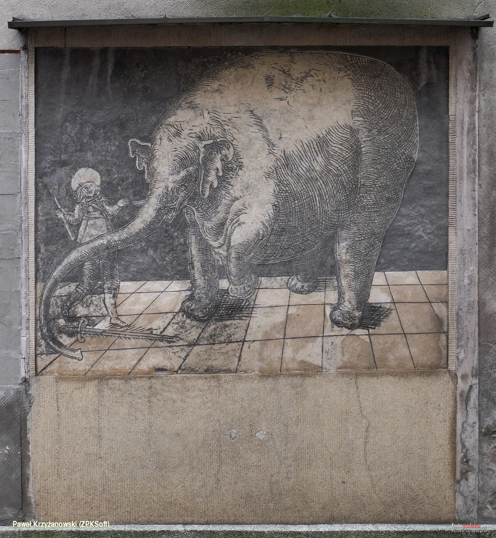 24 października 2019 , Na bocznej elewacji kamienicy Rynek 26, od strony ul. Zajazdowej w 1914 r. odkryto zabytkowe sgraffito z 1639 r. Przedstawia tresowaną słonicę Hasken podnoszącą miecz, prawdopodobnie podczas pokazu w Trzebiatowie. To dzieło nieznanego autora.Skomentuj zdjęcie