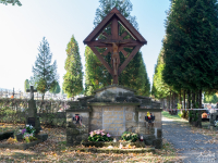 Cmentarz wojenny nr 302 więcej zdjęć (19) Architekt: Franz Stark Zbudowano: 1914 Zabytek: A-377 z 25.01.1994 Ten cmentarz ulokowano w środkowej części cmentarza parafialnego, na wzgórku, w odległości 400 m od kościoła. Przy dróżce na cmentarz, na mostku nad Sanką, słup informacyjny. Złożono tu 22 Austriaków z 58, 83 i 95 pułku piechoty, 18, 33 i 35 pułku piechoty landwery, 24 i 29 batalionu strzelców polowych; 152 Niemców z 217, 218, 219 i 220 pruskiego rezerwowego pułku piechoty; 102 Rosjan z 50, 147, 292 i 296 pułku piechoty. 109 mogił pojedynczych, 54 zbiorowe. Daty śmierci: 1914. Projektował Franz Stark. Duża kwatera wojenna na planie prostokąta. Obecnie nie ma ogrodzenia, jego dawny zasięg wskazują rzędy starych drzew. Po ostatnim remoncie jest tu 13 wydłużonych mogił zbiorowych, ustawionych poprzecznie do alei i ujętych w betonowe krawężniki. Na większości betonowe stele z żeliwnymi tablicami imiennymi, na pozostałych krzyże żeliwne i listwowe dwóch typów. Na osi cmentarza stylizowany ołtarz polowy z dwuspadowym zwieńczeniem, a na nim drewniany krzyż łaciński. Pod nim tablica z napisem:"Z szarej codzienności przybyliśmy; przez próg życia odeszliśmy ze skroniami zwieńczonymi laurem". Powierzchnia 276 m2. Stan dobry. źródło: Nazwiska pochowanych są na stronie Cmentarz parafialny więcej zdjęć (6) |