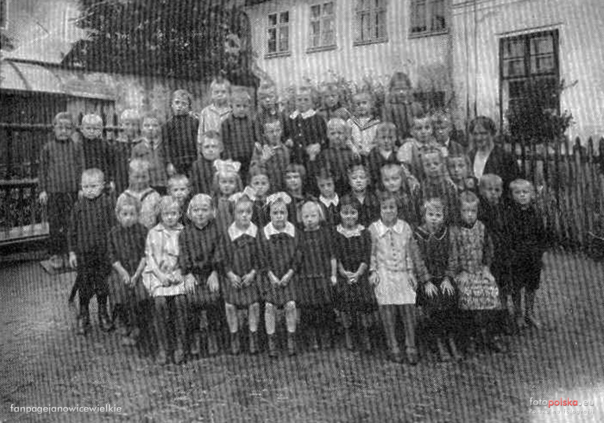 1927 , Uczniowie wraz nauczycielką - panną Fuchs przed budynkiem katolickiej szkoły w Chełmsku Śląskim. |