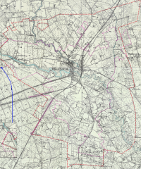Lata 1927-1929 , Mapa Wielbarku przygotowana z dwóch wycinków niemieckiej mapy topograficznej z lat 1927-29 z naniesionymi współcześnie dawnymi granicami miasta (kolor czerwony) i obecnymi granicami (kolor liliowy) |
