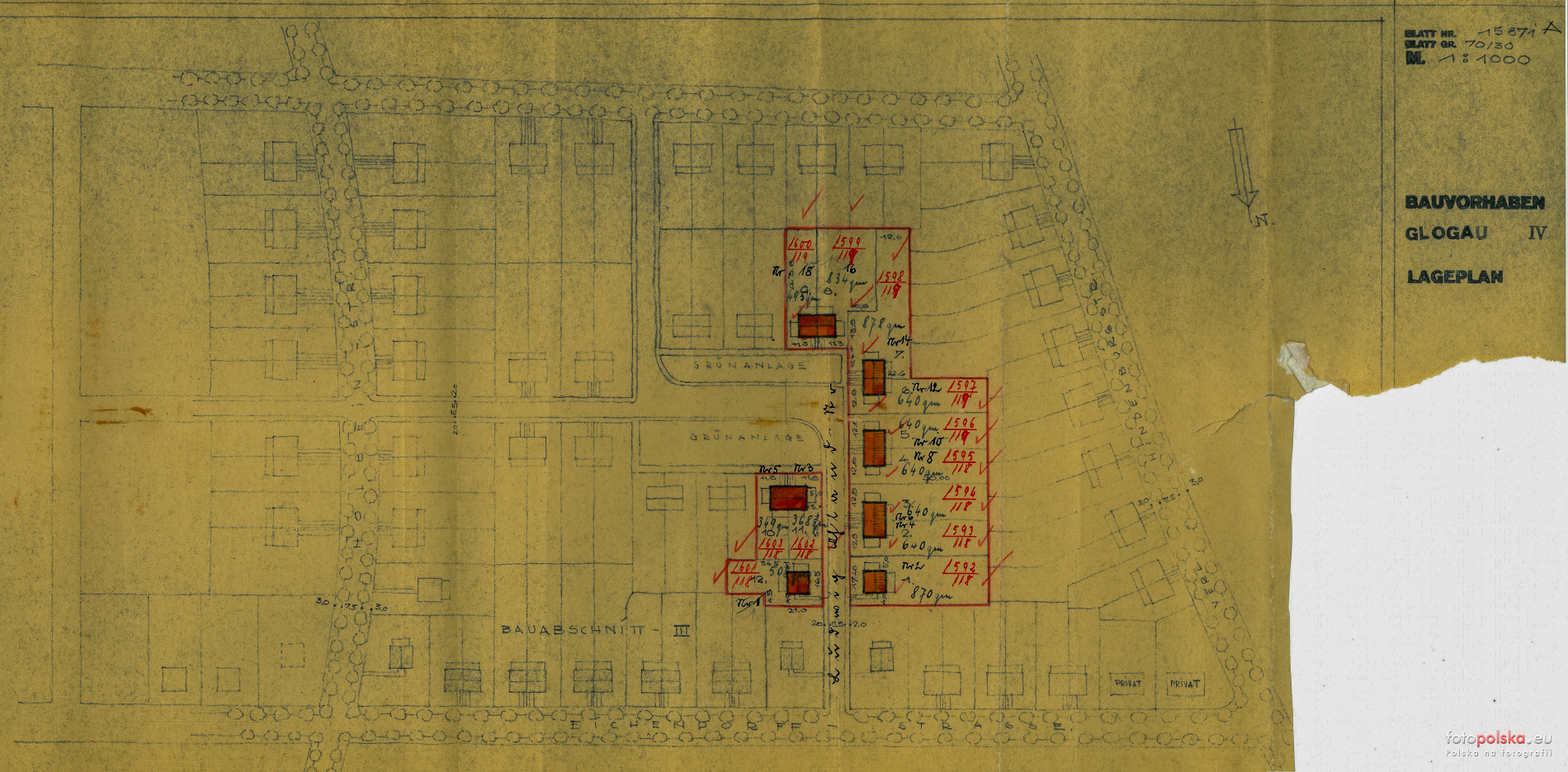 1936 , Plan części Głogowa z zaznaczonymi na czerwono projektowanymi budynkami.Skomentuj zdjęcie |