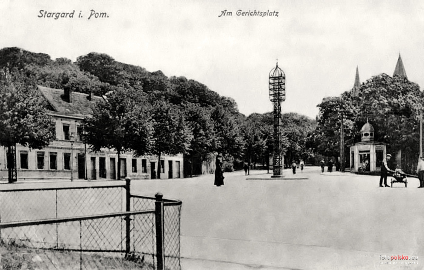 4 pobrania 621 odsłon 6 średnia ocen Poprzednie i następne zdjęcia Bogusław52 Obiekty widoczne na zdjęciu pl. Wolności więcej zdjęć (113) Dawniej: Gerichtplatz, Adolf-Hitler-Platz, Plac Stalina Gerichtsplatz (Plac Wolności). Nazwa placu pojawia się po raz pierwszy na planie z 1878 r. Wywodzi się od budowanej tutaj w latach 1874–1876 siedziby sądu. Przy placu znajdowało się 6 numerowanych posesji. Mieściły się w nich kolejno od prawej: straż pożarna, restauracja oraz pod nr 5 Hotel Kaiser Hof, który reklamował się jako pierwszy w Stargardzie, który oświetlał pokoje światłem elektrycznym. W 1900 r. był on własnością Franza Czecha. Budynek pod nr 6 – był siedzibą sądu. (MAH Stargard) W.S --------- Z pamiętnika Ingrid Schwichtenberg z domu Ziemer zam. Stargard, Grosser Wall 17 (ul.Chrobrego) "Całe śródmieście stało się morzem ognia. Nie dało się rozróżnić żadnych szczegółów. Na Placu AH (Plac Wolności) ukazał nam się jeszcze straszniejszy widok. Także tu płonęły domy. A na środku ronda, na drogowskazie wisiał żołnierz. Jego ciało bujało się w tej burzy w obie strony. Mówiło się, że co sześć godzin wiesza się w tym miejscu kolejnego, który albo chciał się poddać, albo dokonał samookaleczenia. Jego „wykroczenie“ wypisywano na tablicze, którą następnie zawieszano na ciele ofiary. Już od dłuższego czasu obawiałam się, że będę mimowolnym świadkiem takiej egzekucji, gdyż moja droga do pracy przebiegała przez plac. Na Bahnhofstrasse (ul.Wyszyńskiego) słychać było wycie zwierząt z płonących budynków rolników. Dopiero na ul. Szczecińskiej zrobiło się spokojnie. Przynajmniej nie musiałam już myśleć o pożarach. Tu jeszcze mój ojciec został skontrolowany i poinformowano go, że nie może opuścić miasta, gdyż jest w wieku obowiązkowej służby w Volksstturmie." (W.S) |