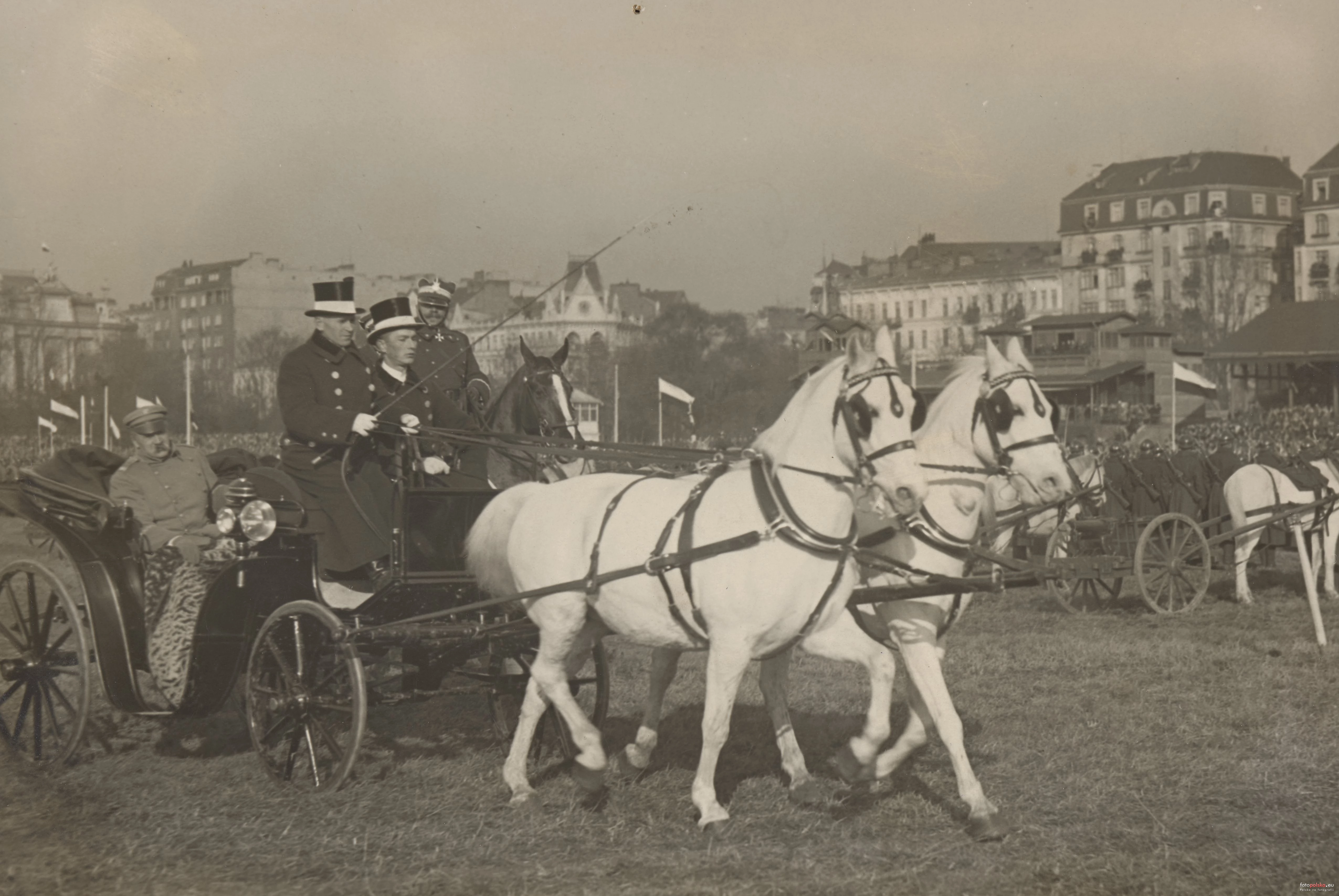 11 listopada 1928 , Obchody święta 11 listopada w Warszawie. Marszałek Józef Piłsudski przybywa powozem konnym na uroczystości na Polu Mokotowskim. Widoczny także m.in. wiceminister spraw wojskowych gen. Daniel Konarzewski (jedzie obok, na koniu). Sygnatura NAC nr 3/22/0/-/259/2. Z tyłu widoczne kamienice przy ulicy Polnej.