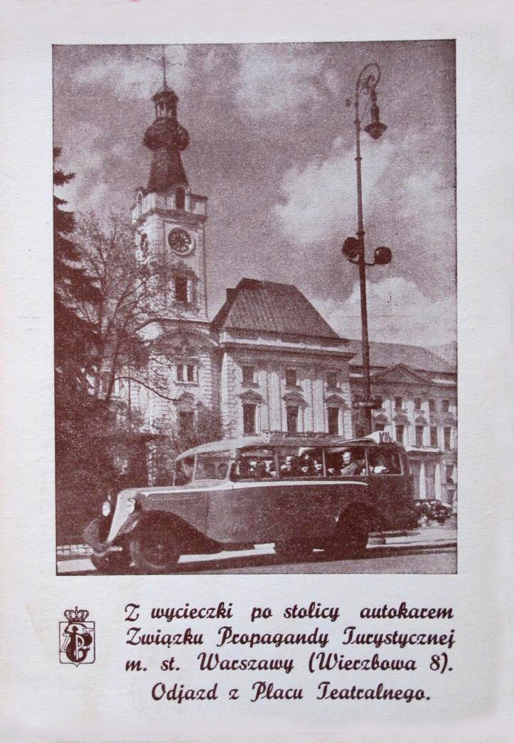 1939 , Autokar Związku Propagandy Turystycznej miasta stołecznego Warszawy. Na odwrocie informacja: "Stałe zwiedzanie Warszawy autokarem. Odjazd we wtorki, czwartki, soboty, niedziele i święta o godz. 11.10 z Placu Teatralnego".Skomentuj zdjęcie